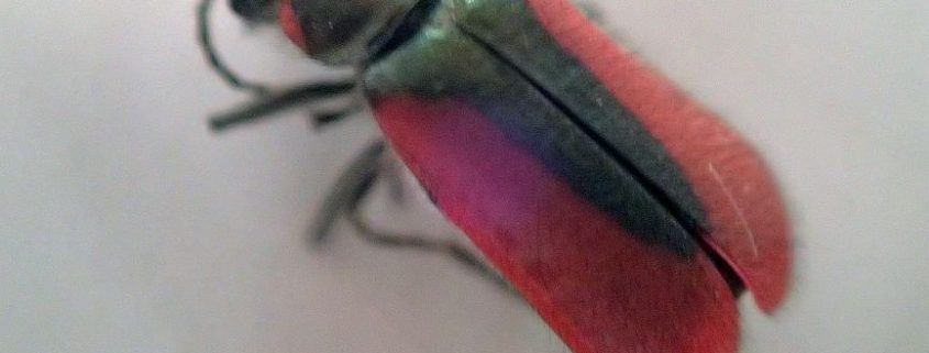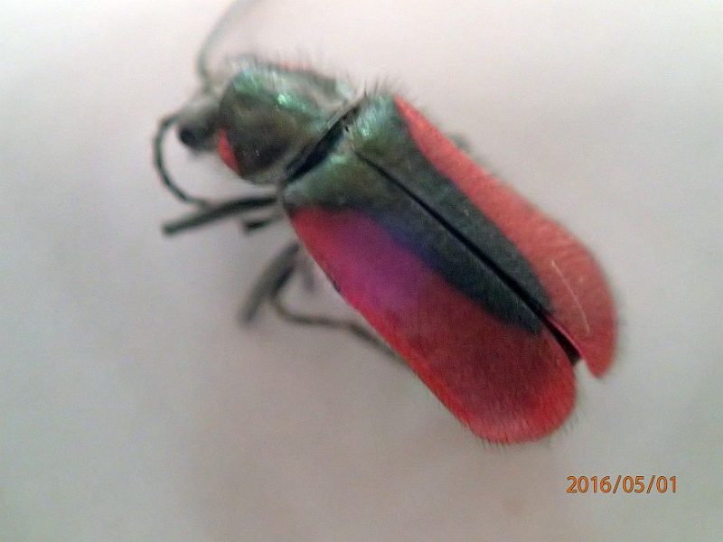 This appears to be a scarlet malachite beetle, Malachius aeneus (Coleoptera: Melyridae); see http://tinyurl.com/zqh9yee for an image. The larvae of these beetles are predaceous on other small arthropods. Ed Saugstad, retired entomologist; Sinks Grove, WV.