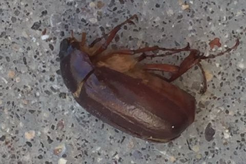 This is a type of scarab beetle (Coleoptera: Scarabaeidae) known as a May beetle or June bug; it appears to be in the genus Phyllophaga – see http://tinyurl.com/jrz4e7a for an example. They often are attracted to lights at night; they are rather clumsy fliers so there’s no telling where one might find them in the morning. Ed Saugstad, retired entomologist; Sinks Grove, WV.