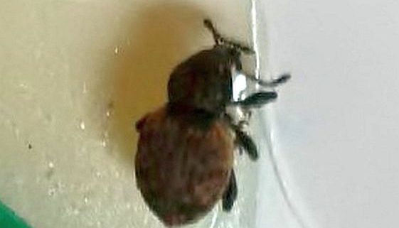 This is a weevil (Coleoptera: Curculionidae), a member of a huge family that includes thousands of different species. This one does not appear to be any of the commonly encountered pest species and likely simply is an accidental intruder. Ed Saugstad, retired entomologist; Sinks Grove, WV.