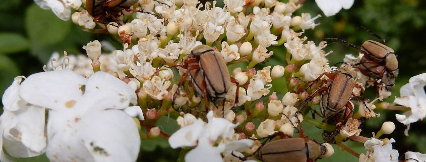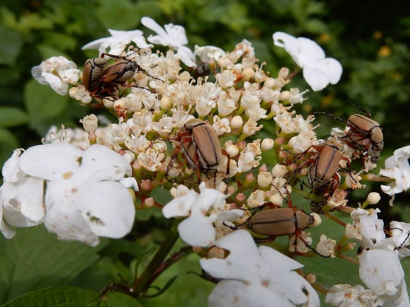 These appear to be rose chafers (Macrodactylus subspinosus; Coleoptera: Scarabaeidae), a destructive pest species. See http://tinyurl.com/hdg4zfx for some control suggestions. Ed Saugstad, retired entomologist; Sinks Grove, WV.