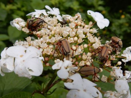 5711 Something is eating the leaves on my snowball bush. This is the third year. The leaves are like lace, but I can never see any grubs, day or night. All I see is a number of these little characters. Could this be the culprit? If so, how do I spoil his lunch? Brian