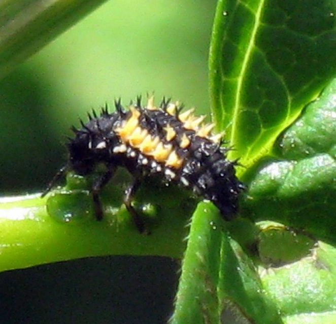 This is a larva of a lady bird beetle, likely that of the Asian multi-colored lady beetle, Harmonia axyridis. These are general predators on other small, soft-bodied insects and will not damage plants – see http://tinyurl.com/kp3ucph for more detailed information. Ed Saugstad, retired entomologist; Sinks Grove, WV.