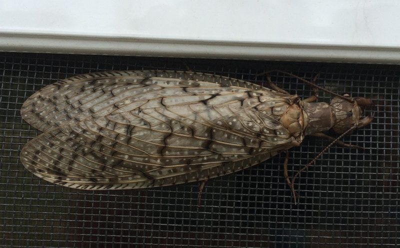 This is a female eastern dobsonfly, Corydalus cornutus (Megaloptera: Corydalidae); their aquatic larvae are known as hellgrammites and often used as fish bait.
