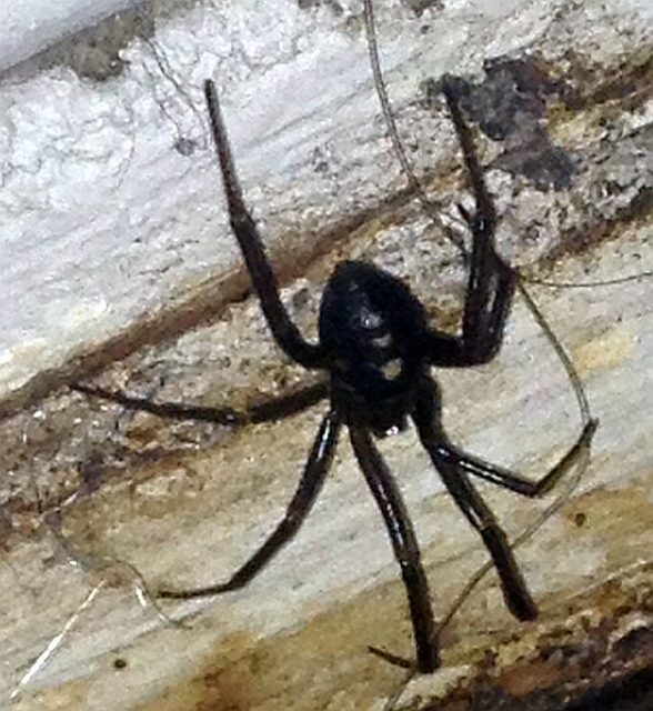 This might be a western black widow spider, Latrodectus hesperus, but I would like to see a clearer view of its eye pattern. Although these spiders possess a potent venom, they are not at all aggressive towards humans, and usually bite only if handled roughly. Ed Saugstad, retired entomologist; Sinks Grove, WV.