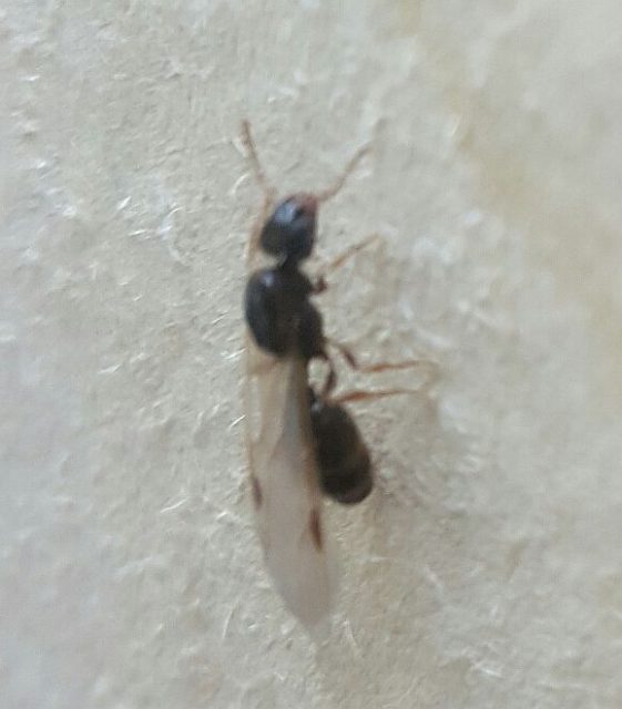 This is a winged female reproductive ant, likely a Modoc species carpenter ant that has emerged from a satellite nest in your home. Because it is warm in your home, reproductive ants think it is spring and time to leave the nest to start a new nest. They fly to windows attempting to get outside. Trapped inside, they will die. For control solutions see: https://bedbugexperts.com/ants/carpenter-ants
