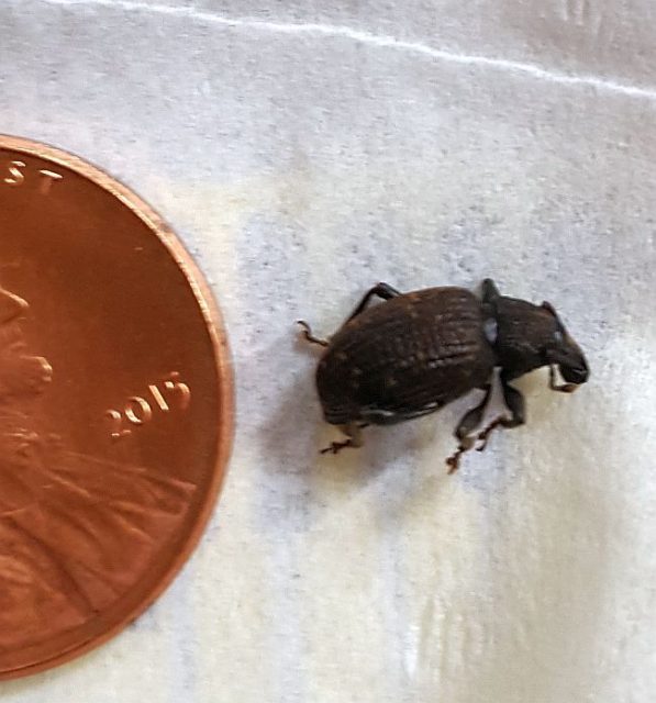 This is a weevil (Coleoptera: Curculionidae). It does not resemble any of the commonly encountered pest species, so it most likely is simply an accidental intruder. Ed Saugstad, retired entomologist; Sinks Grove, WV.