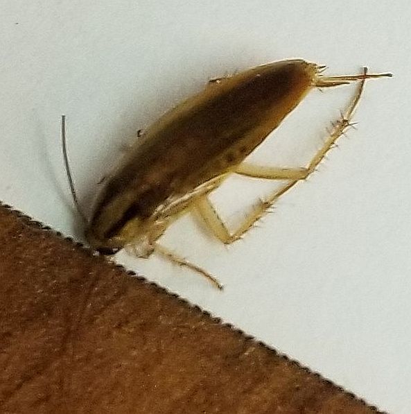 This is a German cockroach, Blattella germanica (Blattodea: Ectobiidae), a peridomestic species that is notoriously difficult to control in multiple-unit dwellings. See https://tinyurl.com/h3nd9z8 elsewhere on this site for some cockroach control recommendations. Ed Saugstad, retired entomologist; Sinks Grove, WV.