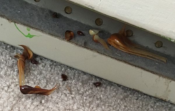 6172 Attached is a photo of possible bug eggs that were found beneath a baseboard heater in Ottawa, ON. The bottom of the heater is very dusty but these “eggs” were not which suggests that they are new, although this is unknown. It is currently November and there is snow on the ground. These “eggs” were found indoors. They are about the size and shape of popcorn kernels. It is also unknown what the two larger objects are (the long one on the carpet on the bottom left and the one on the baseboard heater on the top right). Please let me know if any of these look familiar. Thanks. Erin