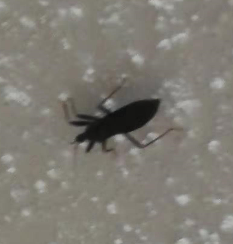 6506. Black colour with six legs and wings, found on the roof of bed room inside house in the evening of July 25th 2019. Size of a quarter coin. Weather is sunny during the day, around 28 degrees Celsius. Child had one insect bite last night on the face, almost not visible by end of day today, not sure if it is by this insect. Is this a kissing bug? Markham, Ontario. Canada