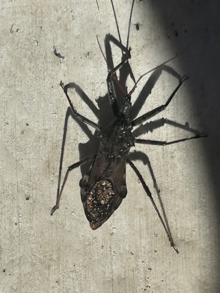 Number 7513. This is an assassin bug (Hemiptera/Heteroptera: Reduviidae) known as a wheel bug (Arilus cristatus).These are general predators on other arthropods, mainly other insects. Although not aggressive towards humans, they can deliver a very painful bite if mishandled. See wheel bug detailed information on this fascinating insect.