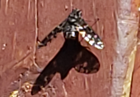 Number 6638. This is a bee fly (Diptera: Bombyliidae), likely in the genus Xenox; Click here for an example. These are parasitoids on solitary ground and cavity-nesting bees (including carpenter bees).