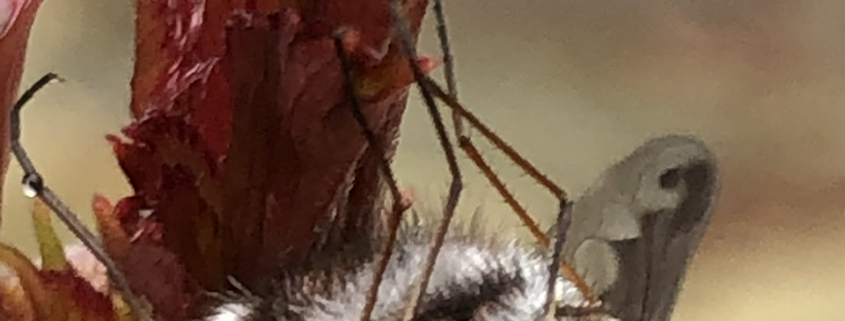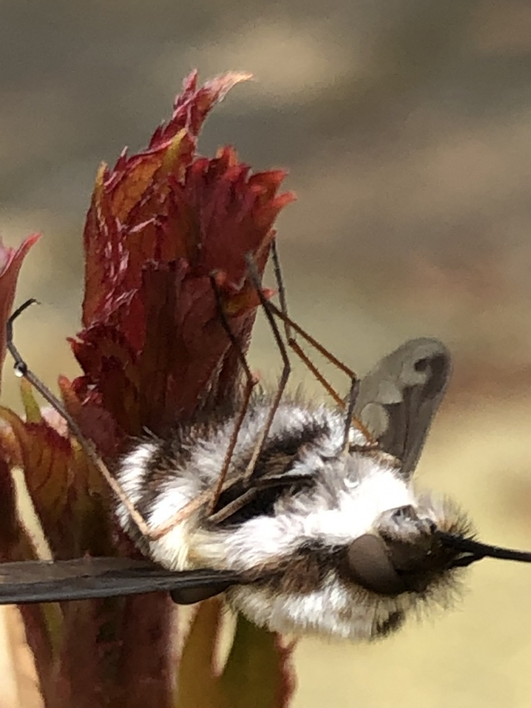 Number 7338. This is a bee fly (Diptera: Bombyliidae); it looks like Bombylius anthophilus. Adult bee flies are nectar feeders while their young are parasitic in the nests of solitary bees and wasps, feeding on both their larvae as well as the food stores in the nests. See Bee fly Image