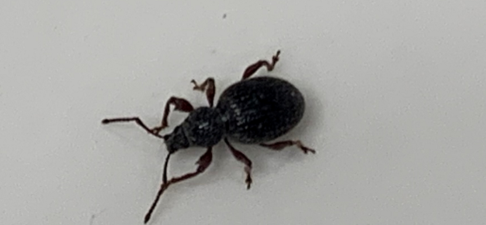 Number 6517. This is a broad-nosed/short-snouted weevil (Coleoptera: Curculionidae; subfamily Entiminae); these often enter buildings in search of shelter, but do no harm there. The larvae of some species, such as the strawberry root weevil and the black vine weevil, can be serious pests. Click here for more detailed information.