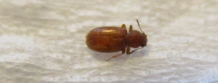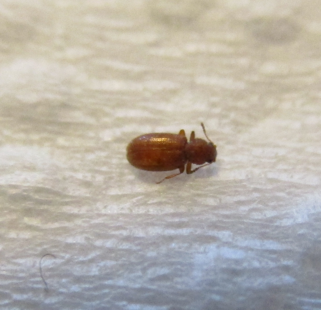 7203. I’ve found a few of these in the bedroom a week after noticing itchy bites that look like bed bug bites, many in a row/cluster pattern. It’s very small (1-3mm long) and although it looks like a bed bug from the bottom, the top view looks very similar to the black carpet beetles we’ve seen downstairs. Is this a bed bug or a carpet beetle that happens to be brown? Aurora, Ontario, Canada