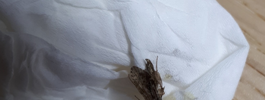 Number 7041. You must live near a body of water (stream/pond/lake) as this appears to be a caddisfly (order Trichoptera) that has lost most of its wing scales – Click here for an example of an intact specimen. Their larvae are aquatic, and most species construct tubular cases that they live in. These are completely harmless, and will do no damage.