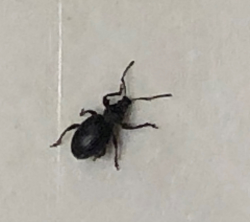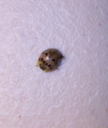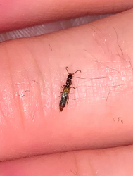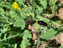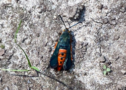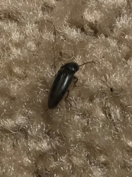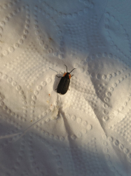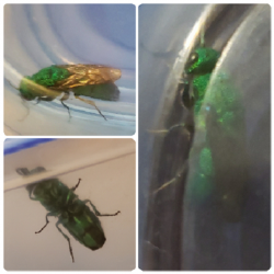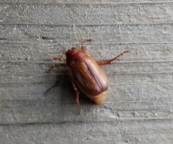 Number 6955. This is a scarab beetle (Coleoptera: Scarabaeidae) in the subfamily Melolonthinae. These often are called May beetles or June bugs; their larvae (white grubs) feed on plant roots underground, and some species can be serious lawn/turf pests. The adult beetles are foliage feeders, but only a few species (such as the Japanese beetle and rose chafer) cause serious damage. There’s not much you can do about them unless you control the larval stage. Click here for an example.