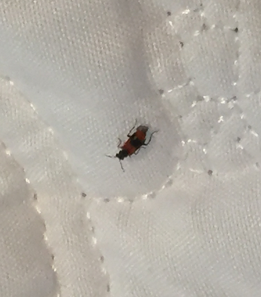 Number 6388. It’s a checkered beetle (Coleoptera; Cleridae). No need to be concerned about this one. Not only would it not be responsible for any bites but it is a beneficial predator on other small arthropods.