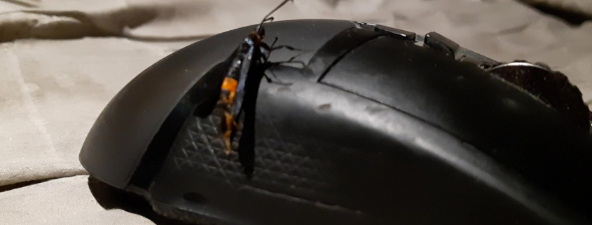 7357.        I looked through a bug list of all wasps, moths and similar shaped insects and could not positively identify this insect based on markings. One list for Ontario, one for Michigan. I suspect it is an ichumen wasp or blue winged wasp along some part of its lifecycle or even a separate sub species that was not available on other sites. Where I expected a stinger at the rear of the insect was a soft fleshy translucent appendage it looked to be using to probe it’s surroundings. This was covered in small hairs. I am no expert and the lists only comprised of 200 odd-ish insects. Enterprise, Ontario. Canada