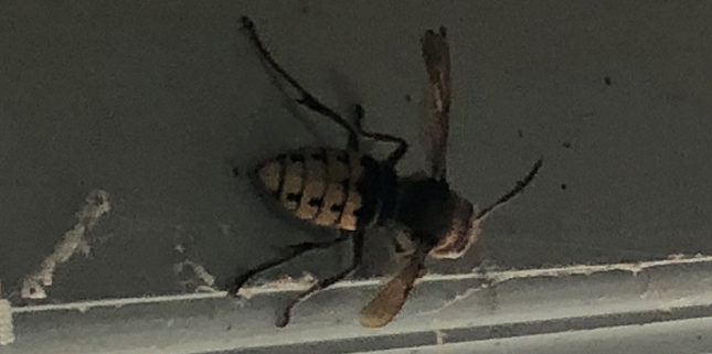 Number 6309 This looks like a European hornet, Vespa crabro (Hymenoptera: Vespidae). These tend to be less aggressive than their smaller cousins, yellow jackets and bald-faced hornets. However, they will sting in response to being stepped on or grabbed and also are defensive of their nests and can be aggressive around food sources. They primarily are carnivorous and hunt large insects, but also will feed on fallen fruit and other sources of sugary food. Click here for more detailed information.