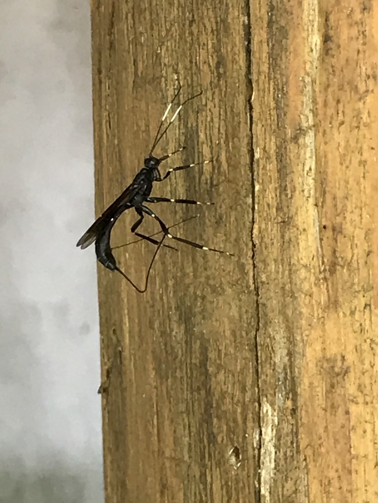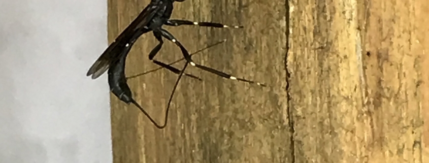 Number 7273. This is a female ichneumon wasp (Hymenoptera: Ichneumonidae) using her long ovipositor to drill into the tunnel of a wood-boring insect. The egg she deposits there will hatch into a larva that will then feed on the insect in the tunnel. Female ichneumon wasp detailed information