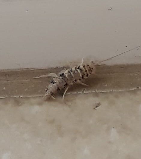 Number 6336 This looks like a firebrat (Thermobia domestica; Zygentoma: Lepismatidae), a cosmopolitan nuisance pest. Click here for more detailed information and click here for some control suggestions.