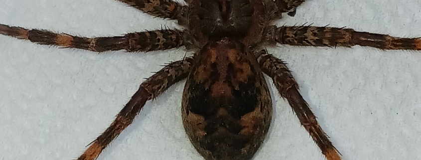 Number 7354. This is a fishing spider (family Pisauridae) in the genus Dolomedes. They are not aggressive, but large specimens can deliver a painful (but not dangerous) bite if handled carelessly. See Fishing spider detailed information