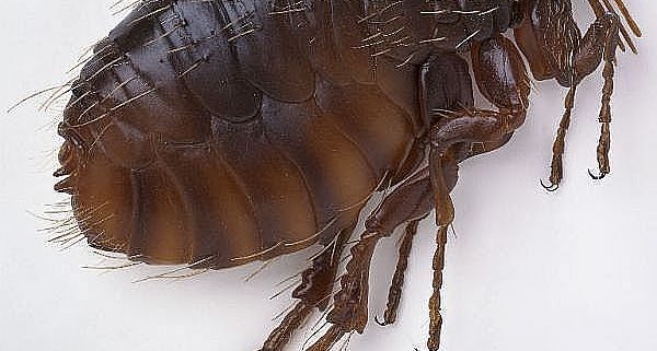 Fleas have a darkly colored, hard body that is laterally flattened (squished from side to side). This body shape helps the flea to move between the hairs or feather on its host’s body.