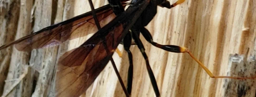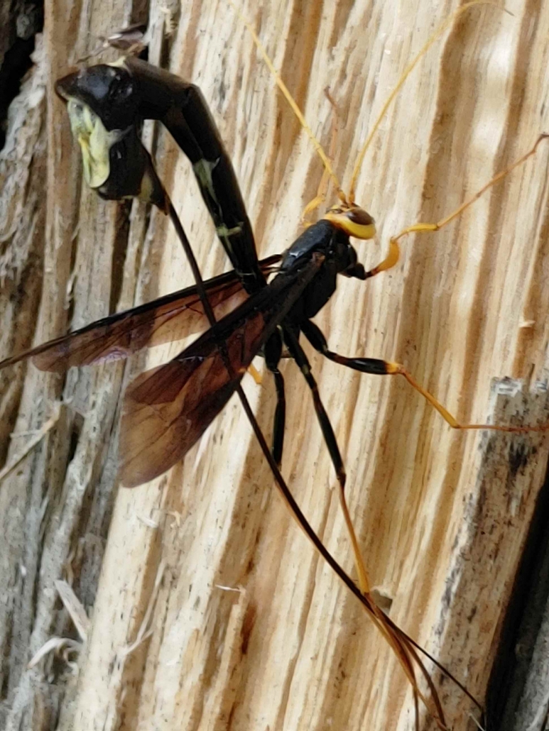 Number 7237. This is Megarhyssa atrata, a giant ichneumon wasp (Hymenoptera: Ichneumonidae). These wasps use their long ovipositor to insert their eggs into the tunnels made by larvae of wood wasps in the family Siricidae. When the eggs hatch, the ichneumon larvae feed on the wood wasp larvae. These wasps have no stinger or venom, and are harmless to humans. Giant Ichneumon Wasp Life History