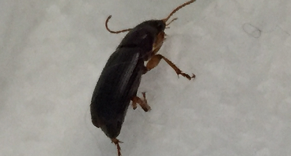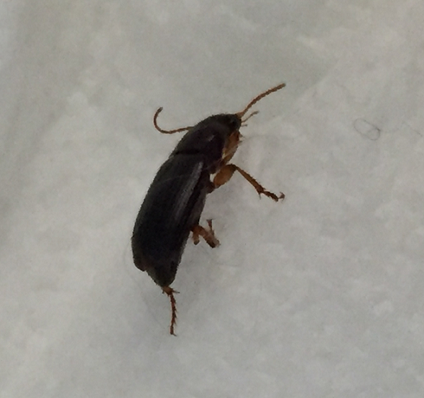 Number 6561. This is a ground beetle (Coleoptera: Carabidae), the vast majority of these are general predators on other small arthropods. It is extremely unlikely that it was the cause of your husband’s discomfort. Click here for more detailed information
