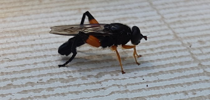 Number 6496.  This appears to be Chalcosyrphus curvaria, a hover/flower fly (Diptera: Syrphidae); Click here for an image. Their larvae reportedly feed in rotting wood; perhaps on the fungi therein.