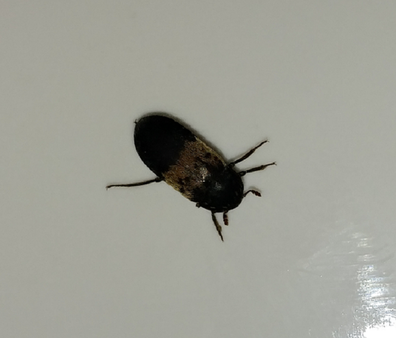 6780. I find one of these little beetles on carpeted areas in my house once every two months independent of the season. Is it a variation of a carpet beetle? Photos taken of a specimen on ceramic for clarity, one from above and one of the underside to help identification. Thanks. Port Hope, Ontario. Canada