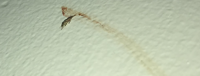 Number 7434. This appears to be a larva of a lacewing (Neuroptera: Chrysopidae). These are general predators on other small invertebrates, mostly other insects. For reasons unknown, they occasionally will ‘sample’ human skin, but their bite is harmless to humans. See lacewing detailed information .