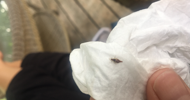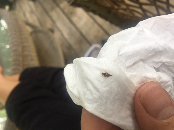 Number 6445. This is a larva of a lacewing (Neuroptera: Chrysopidae). These are general predators on other small, soft-bodied arthropods such as aphids and caterpillars. Occasionally, they will ‘sample’ human skin, but their bite is harmless.