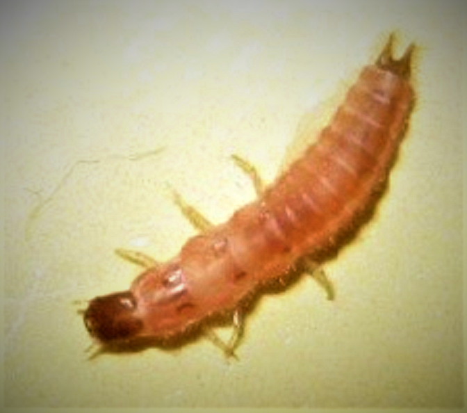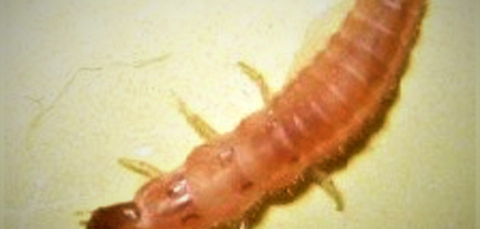 Number 6652. This is a larva of a scarlet malachite beetle, Malachius aeneus (Coleoptera: Melyridae) – Click here for detailed information. This is not a pest, but simply an accidental intruder. They are general predators on other small arthropods.