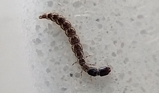 6533. Found 3 days ago, under coffee machine. It moves sinusoidally, and will jump/spring. It seems to be able to use the tip of it’s abdomen to anchour and jump. The length is about 2 cm stretched out. Since it doesn’t have wings I assume it’s a larva. When stretched out the corrugations in the abdomen look brown. Coquitlam, BC. Canada
