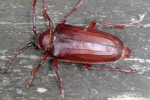 Number 6992. This is a long-horned wood-boring beetle (Coleoptera: Cerambycidae) in the subfamily Prioninae; likely Prionus californicus, known as the California root borer. Click here for more information.