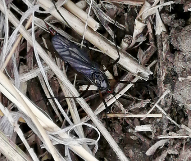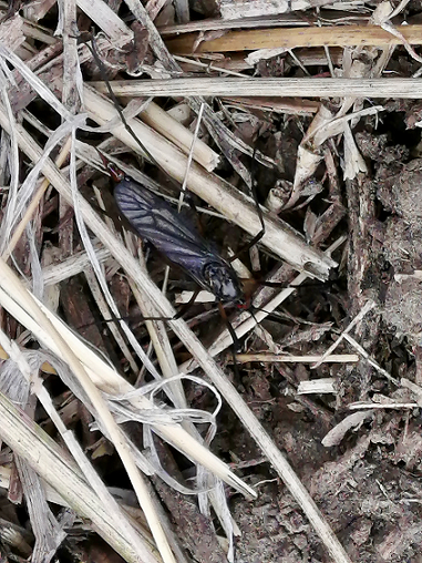 6442. Found outside in research plots in a field near Vanscoy. Two of the same insect were seen fighting. Many have been spotted around the wheat and canola plots. Do not know if they are eating or damaging any of the crops. Insect is approximately an inch long. Have seen them walking/gliding over the ground by walking and possibly using its wings. Have seen none getting higher than a foot off the ground. The days the pictures were taken, approximately 2 weeks ago, it was warm out (not hot) and partially cloudy. Prairie Ln Road, North of Highway 7