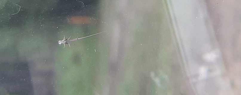 Number 6439. This is a mayfly (order Ephemeroptera). The adults only live for a day or so; just long enough to find mates and lay eggs. They do not feed, but may become nuisances when they emerge in large numbers. They spend most of their lives as nymphs in streams and ponds/small lakes where they constitute an important link in the aquatic food web. They actually are quite common in the Yukon, Click here for details.