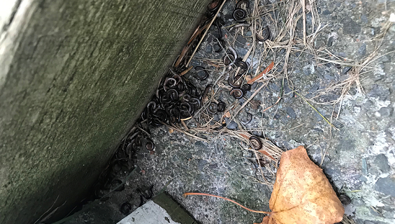 6718. Please zoom in and see what these are. They are multiplying on my walkway and huddle together. Is this some time of snake? St. Johns, NL. Canada