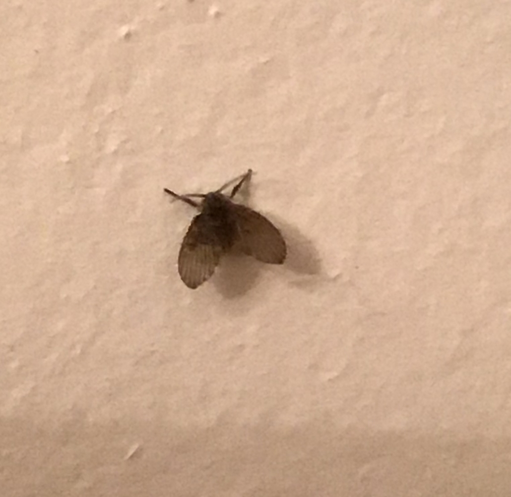 Number 7136. This is a moth fly (Diptera: Psychodidae). Also known as drain flies or sewer flies, their larvae feed on decomposing organic matter and are often found in floor drains, seldom-used commodes, and the like. Although they can be nuisances, they do no real harm, and chemical control seldom is required. Click here for some other suggestions.