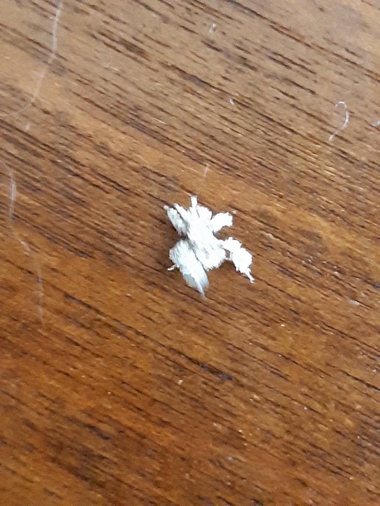 7045. I found this little guy while dusting. Thought it was lint until I saw it moving. I have no idea what it is, pure white. Smiths Falls, ON. Canada