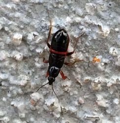 This is an earwig (order Dermaptera). Earwigs are very common nuisance pests that usually do little if any actual harm; occasionally, they may cause damage to very tender vegetation. See http://tinyurl.com/h5m54vn for more detailed information. Ed Saugstad, retired entomologist; Sinks Grove, WV.