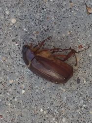 This is a type of scarab beetle (Coleoptera: Scarabaeidae) known as a May beetle or June bug; it appears to be in the genus Phyllophaga – see http://tinyurl.com/jrz4e7a for an example. They often are attracted to lights at night; they are rather clumsy fliers so there’s no telling where one might find them in the morning. Ed Saugstad, retired entomologist; Sinks Grove, WV.