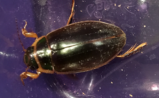 Number 6320 This is a predaceous diving beetle (Coleoptera: Dytiscidae). They and their larvae (often called water tigers) are general predators on other small aquatic life forms, mainly other insects. They also are strong flies and may be found at quite some distance from water.