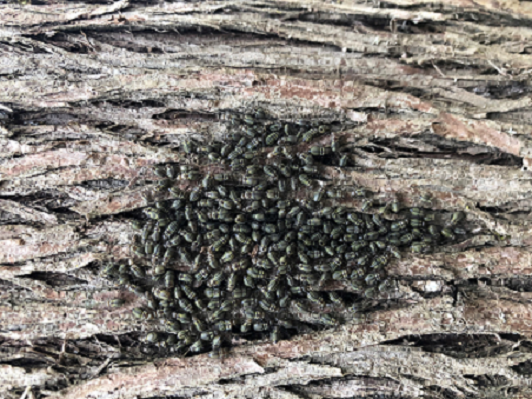 7023. Clusters of these bugs appeared this week (August1) on various tree trunks. The picture is a medium sized cluster. Some trees had many clusters. We are wondering what they are and if they are harmful to the trees. Thank you. Apsley, Ontario. Canada