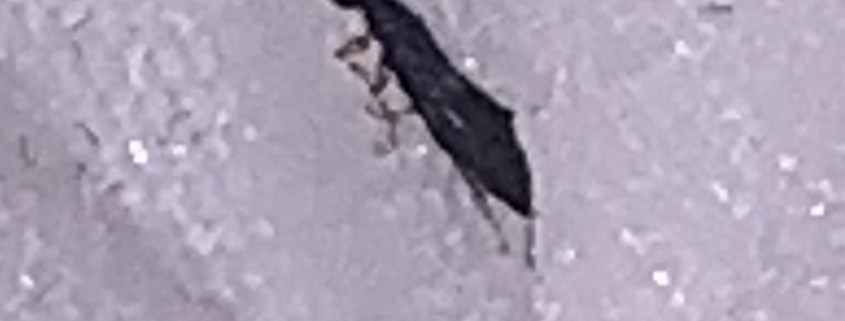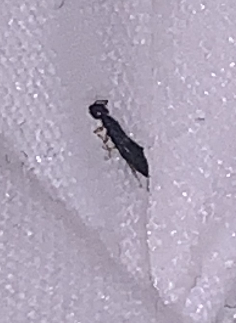 Number 7168. The image is too blurry for me to be certain, but it has the appearance of a rove beetle (Coleoptera: Staphylinidae). That being the case, it is very unlikely to have caused your symptoms. The only rove beetles known to cause any skin lesions are in the genus Paederus, and these are strikingly coloured, with alternating bands of black and orange – Click here for an example. Also, they need to be crushed against skin in order to cause any harm.