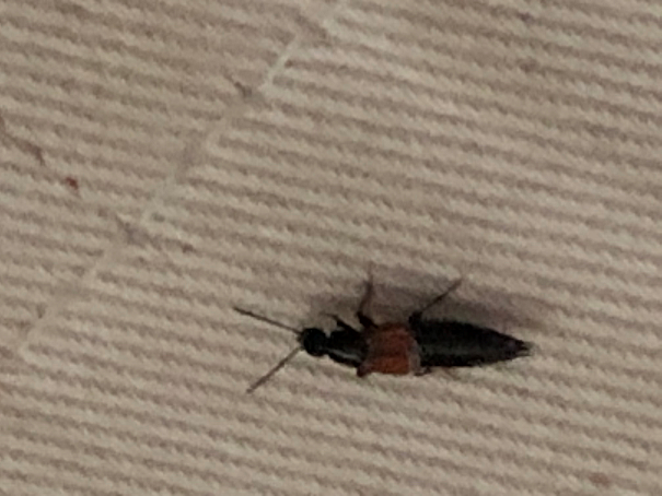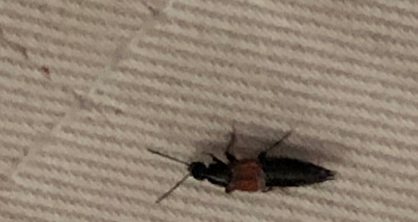 6774.    This bug is only a little over 1/4 inch long. It is black with black legs & a red band around its abdomen. I found several of them crawling around in my office. I’ve seen them flying too, but they are more often found crawling on the floor. They look similar to pictures I’ve seen of earwigs and rove beetles, but I’ve searched online & haven’t seen pictures of either insect that look exactly like this one. Prelate, SK. Canada