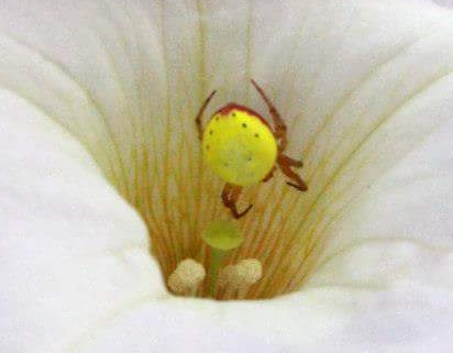 6207 Hi there, I saw this very small spider in a flower. I’ve tried very hard to figure out what type of spider it is and I even looked at your identification photos with no luck. The picture is as zoomed in as my camera could get. As you can see it is bright yellow with bright red legs and red dots. It was in the summer and was found outside. I would love to know what kind of spider it is. Thanks