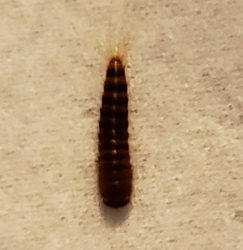 Number 6364 This is a larva of a beetle in the family Dermestidae (carpet/hide/skin/larder beetles, etc.). They will feed on an extremely wide variety of organic materials, primarily those of animal origin. Click here or elsewhere on this site for some control suggestions.
