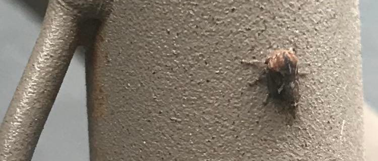 7388. I thought it was a moth but it moves around more like a leaf or tree hopper. The head is the pinkish part, has 3 legs on either side (total 6), was the size of a small pea. Toronto, Ontario. Canada